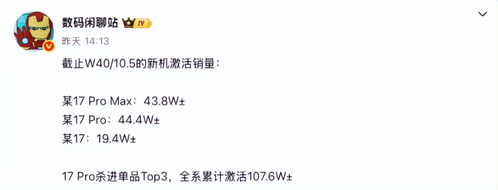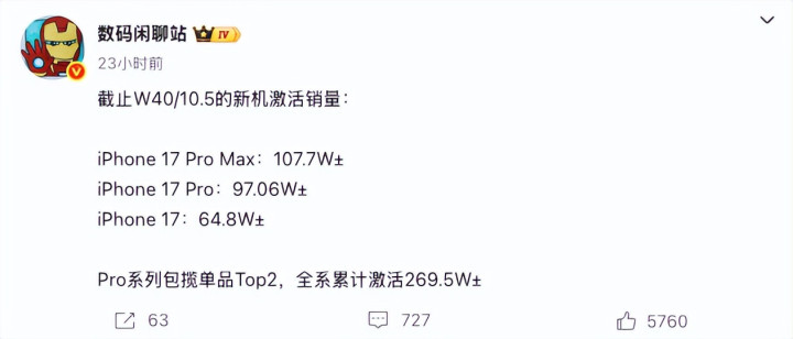iPhone 17 Pro Max以107.7万的激活量居首,iPhone 17 Pro紧随其后,激活量达97.06万,标准版iPhone 17激活量为64.8万,三大机型合计激活量达269.5万。