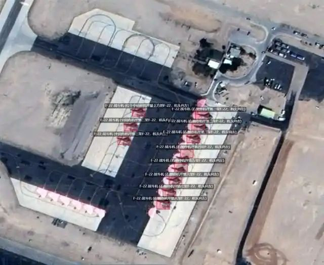 早在开战前,央视就公开了美军中东基地的卫星图像。乌代德、苏丹王子等关键基地内,战机停放、机库布局、防空系统朝向清晰可见;以色列奥夫达基地的11架F-22隐形战机,在高分卫星镜头下无所遁形。